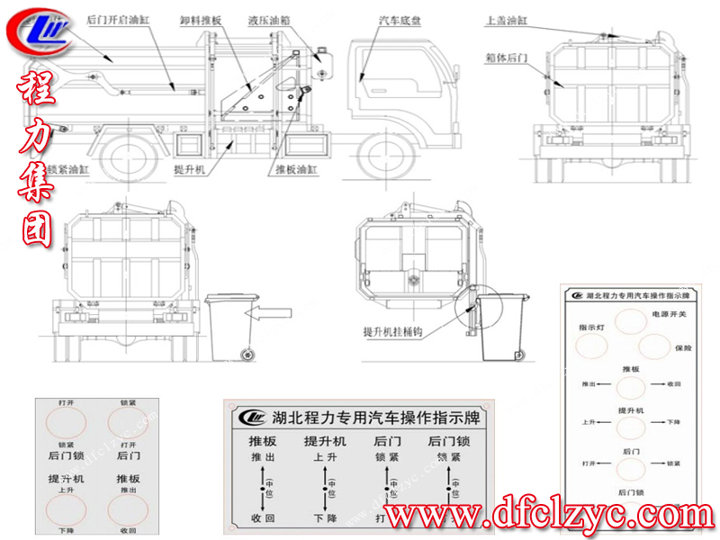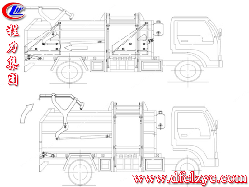 該車操作控制為3個立方分別在駕駛室內(電控),箱體前端手動(備用)和箱體前端提升機旁邊(電控),均可以獨立控制操作該車的工作,具體操作請遵循以下過程進行,在裝載廢物或卸料前,空載運轉到達6個標準氣壓時,掛上取力器(駕駛室內方向盤左下方),液壓油泵開始工作,檢查各部件有無走漏或反常后,再依照操作牌指示方位和操作方法進行操作:同樣地,在該專用車的各項專用功能操作完結后,摘掉取力器,使液壓體系中止工作。