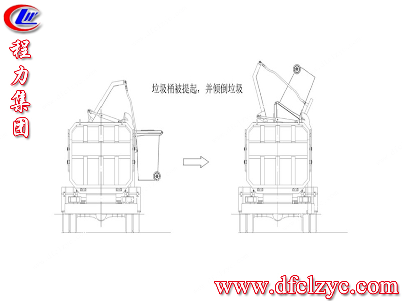 首先將垃圾桶推移到提升機掛鉤處,同時將桶提掛位放在掛鉤上,推動提升機操作開關(或手柄)至上升位置,這時上蓋油缸動作,從而帶動提升機拉桿向上運動,垃圾桶被掛起,同時上蓋也逐漸被打開當提升機和垃圾桶上升到一定位置時,垃圾桶被鎖緊(或壓緊),最后垃圾桶隨提升機翻板一起上升到箱體頂端,上蓋完全打開,并翻倒